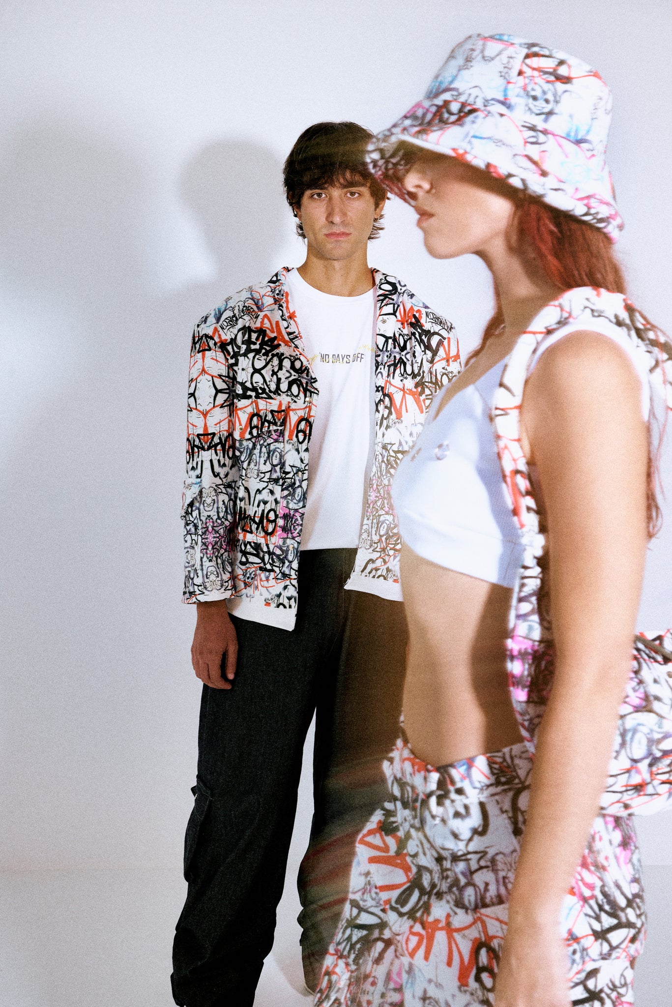 Estiel Studios structured jacket features an all-over graffiti print. It offers a clean, tailored shoulder line and a slightly boxy fit that balances power with ease.